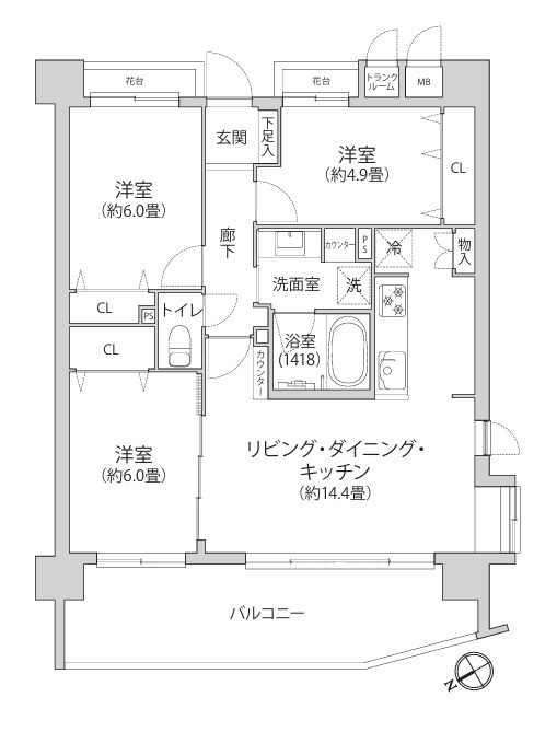 専有面積70.59㎡の3LDKで各居室には収納も完備されています。