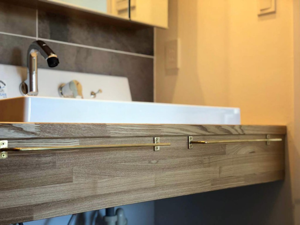 洗面台の裏のタイル(後述)が相まって、穴蔵感のある空間へと仕上がりました。