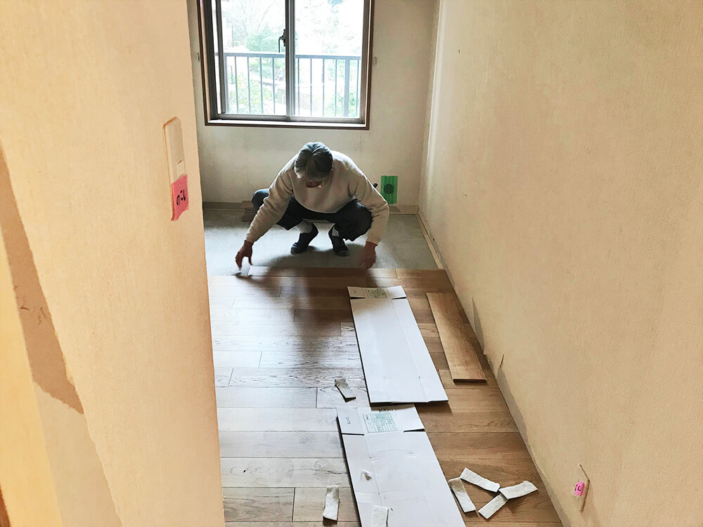 墨出しが完了したら墨に沿って木軸をたてていきます。1本1本垂直に取り付ける必要があるため、レーザーを使用し木軸を立てていきます。木軸をできたらフローリングを貼っていきます。このマンションは遮音等級に指定があったため遮音フローリングを使用しました。遮音フローリングの中にも表面だけ薄い無垢のフローリングが貼ってあるものが存在し、触り心地も無垢フローリングです。置床で遮音を取る以外にもこうした遮音フローリングを用いた遮音の取り方もあります。天井高を目一杯取ることができるといったメリットがあります。今回フローリングは乱尺サイズでしたので、お部屋の大きさに合わせて1枚ずつ選定していきます。また、フローリングのつなぎ目が連続しないよう大工さんのセンスでフローリングを施工していきます。