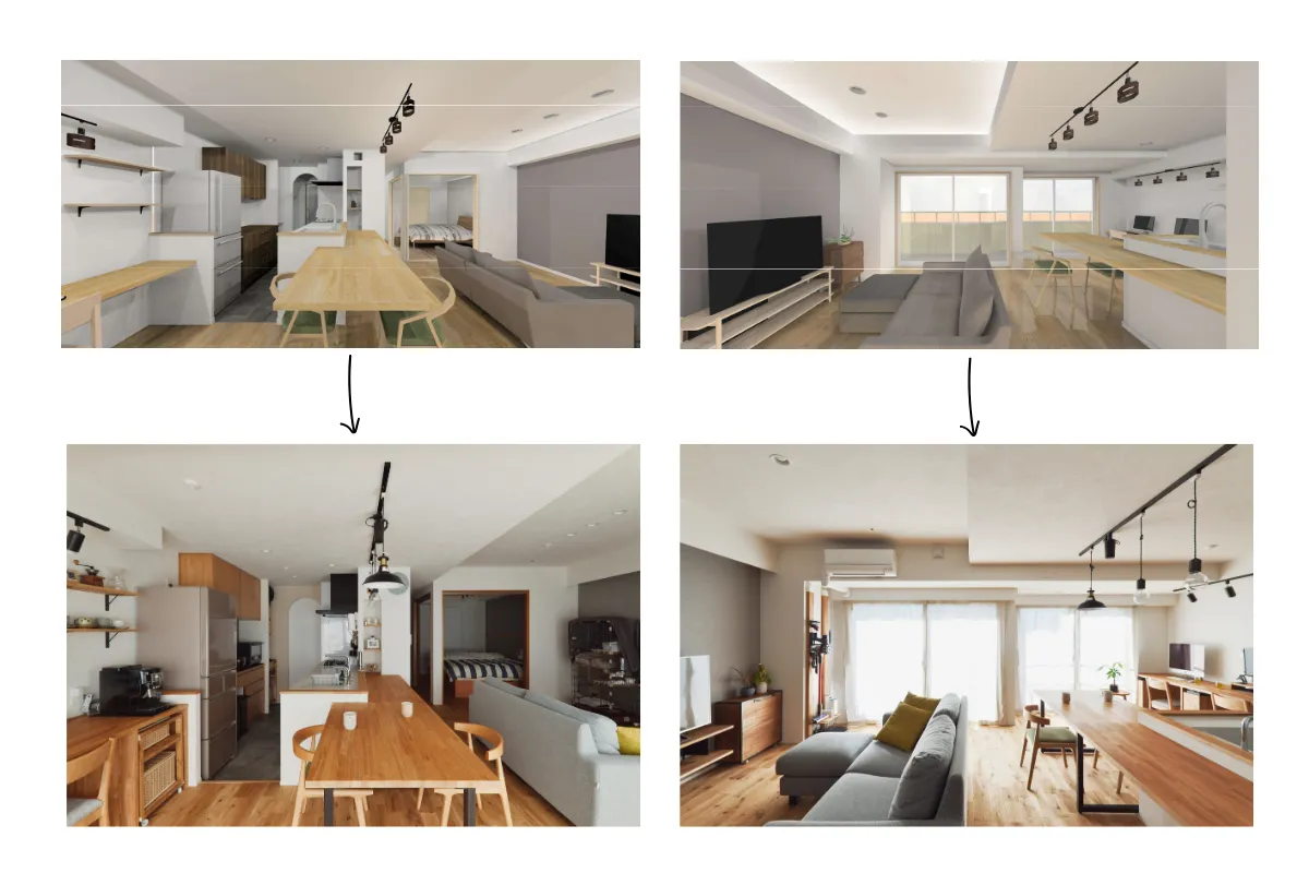 パース上では空間が広く見えるので「大きいソファーが置けそうだ」とか、「天井がこんなに高いなら豪華なペンダント照明も吊るせるのでは」と、実際より大きなお部屋のようにお客様に思わせてしまうのがパースのデメリットでもあります。