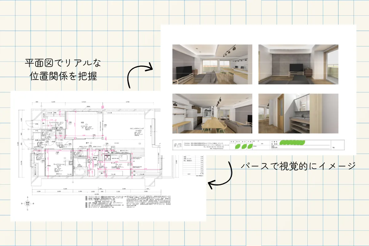 パースはそういった点をカバーすることができ、空間全体を視覚的に把握できるというメリットがございます 。