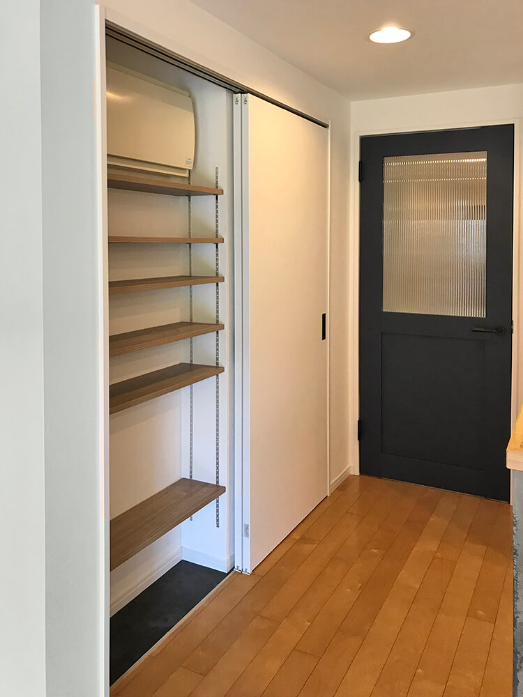 上の写真はキッチンの隣、かつリビング・ダイニングの中にある収納部分です。