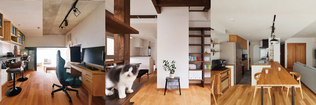 滑りにくい床、傷に強い壁、におい対策など、ペットとの暮らしを考えた素材選び。